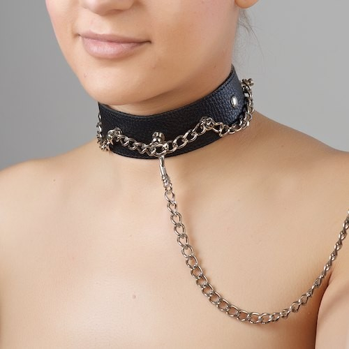 Вам обязательно понравится дерзкий и яркий внешний вид украшения. По периметру украшения проходят металлические цепочки, а длинный поводок крепится к удобному колечку, расположенному в центре аксессуара.