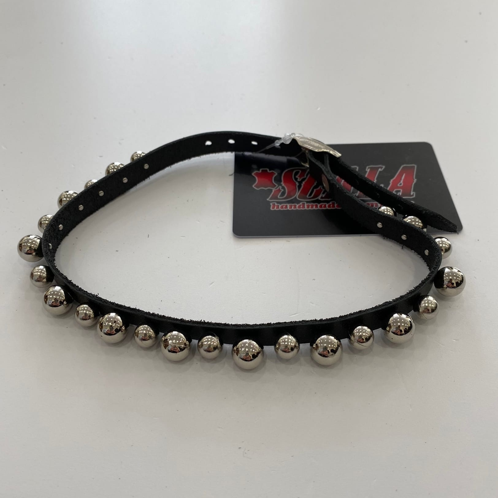 Чокер декорирован серебряными бусами разной величины, бусины закреплены на клепках.