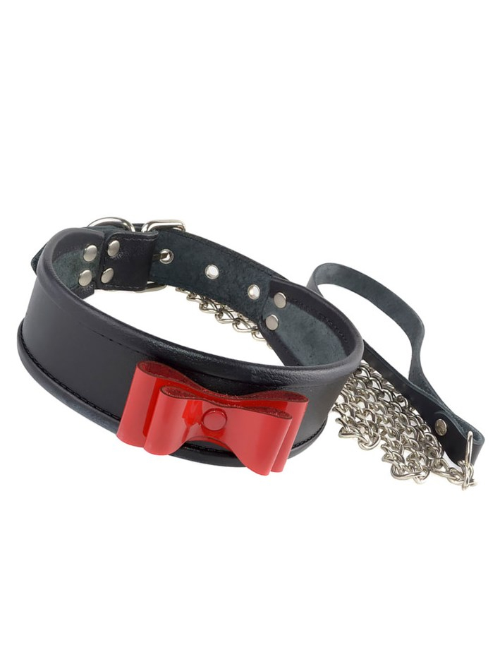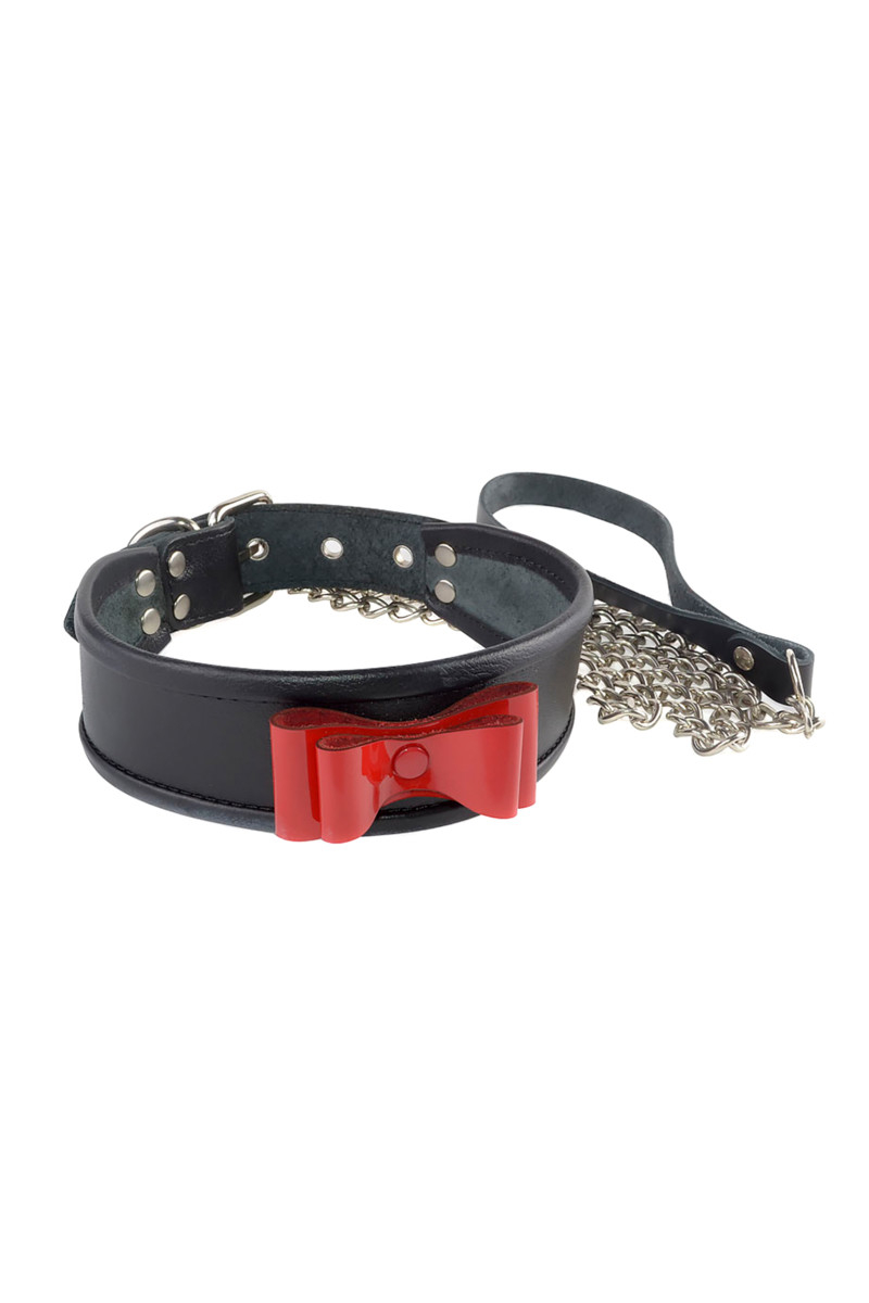 Ошейник изготовлен из высококачественной кожи черного цвета. По краю ошейника проходит оторочка, что обеспечивает комфортное использование при ношении девайса. Кокетливость и яркость лаконичному изделию придаёт объемный бантик из лаковой кожи красного цвета.