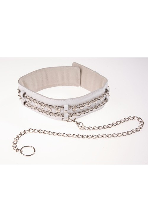 Изготовлен из натуральной кожи с велюровой подкладой. При изготовлении использована никелированная фурнитура. Ширина ошейника 50 мм, длина цепочки (поводка) с карабином 50 см. Размер универсальный. Один из основных атрибутов BDSM.