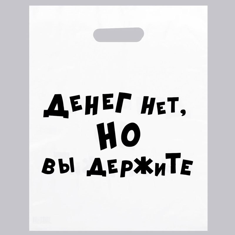 Полиэтиленовый пакет с прорубной ручкой белого цвета с надписью: "Денег нет но вы держите..."