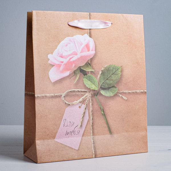Прекрасный подарочный пакет выполненный из плотной крафтовой бумаги и ручек в виде атласных лент. На пакете нарисована нежная красивая роза, с надписью для тебя.