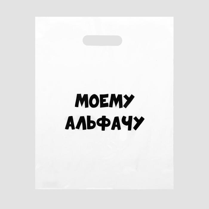 Белый пакет из полиэтилена с вырубленной ручкой и жизненной надписью: " моему альфачу"