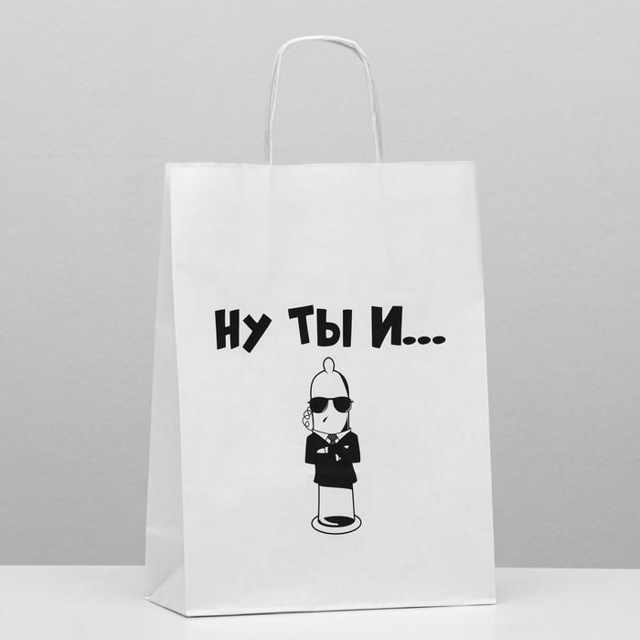 Белый пакет из бумаги с крученной ручкой шпагат, декорирован рисунком в виде гондона в смокинге, с надписью "Ну ты и....." Конечно вы можете сами дописать маркером, что имели в виду, а можете оставить, чтобы получатель додумал сам.