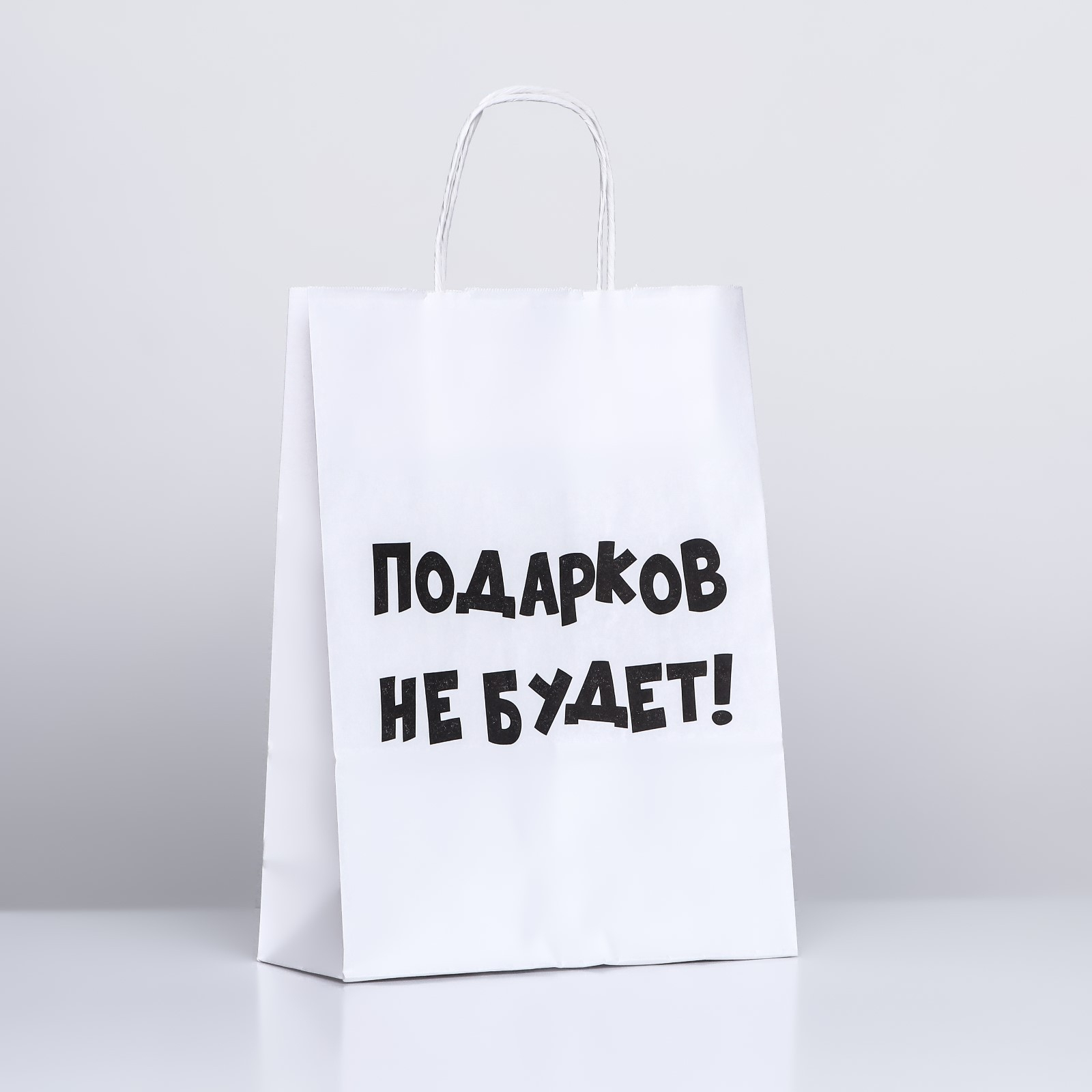 Смешная противоречащая надпись: подарков не будет. Хотя возможно у вас есть такие люди, кому можно подарить этот пустой пакет.