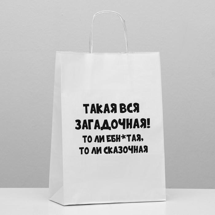 Пакет из белой бумаги с очень жизненной надписью "такая вся загадочная! то ли ебанутая, то ли сказочная", вызовет улыбку и желание заглянуть в пакетик.