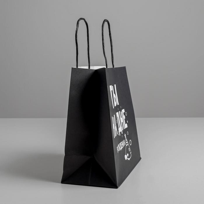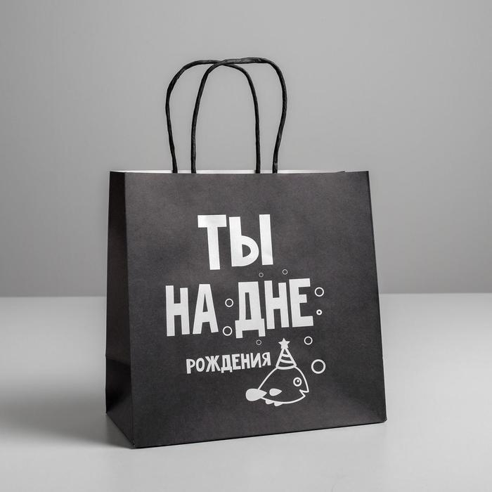 Плотный бумажный пакет с кручеными ручками шпагат выполнен в черном цвете с шуточной надписью "Ты на дне рождения"