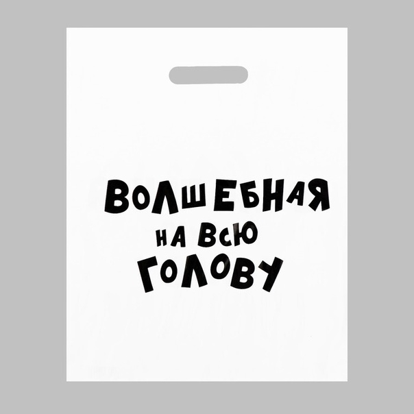 Пакет выполнен из полиэтилена, вырубленная ручка. Пакет белый с жизненной надписью: "волшебная на всю голову"