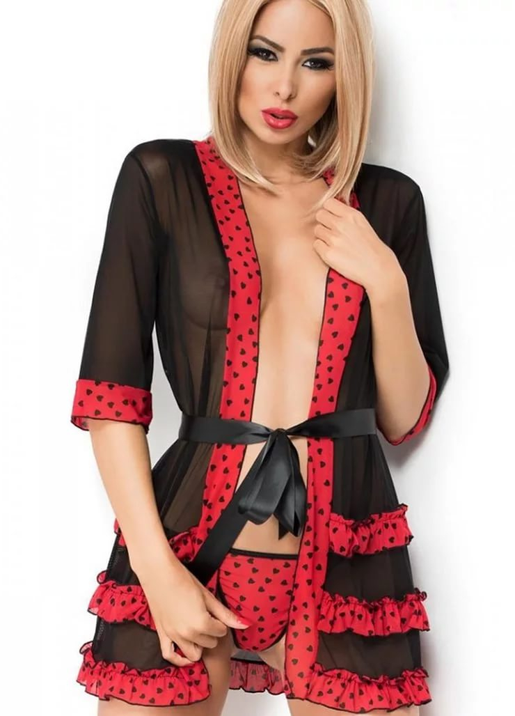 Пеньюар и стринги, черно-красный, рисунок сердечко