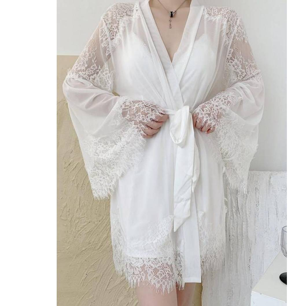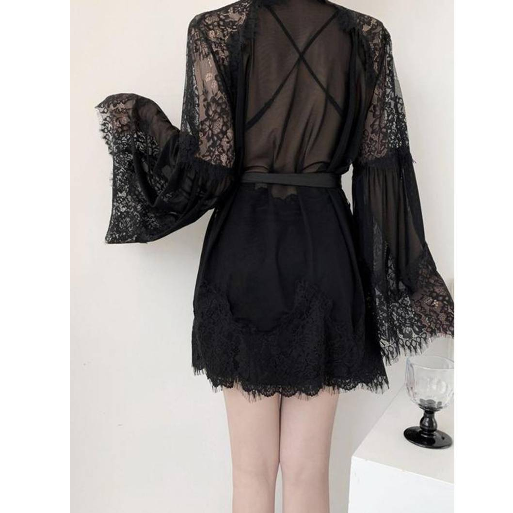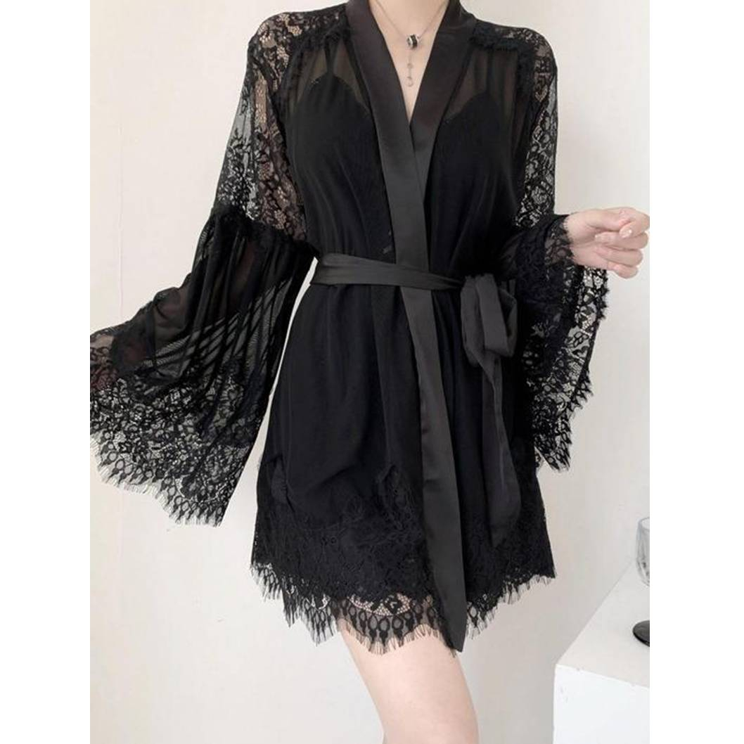 Нежный невесомый пеньюар, выполненный из прозрачной сетки и декорирован кружевом по рукавам и подолу. Рукав широкий и расклешенный. Пеньюар запахивается как кимоно и завязывается на атласный пояс.