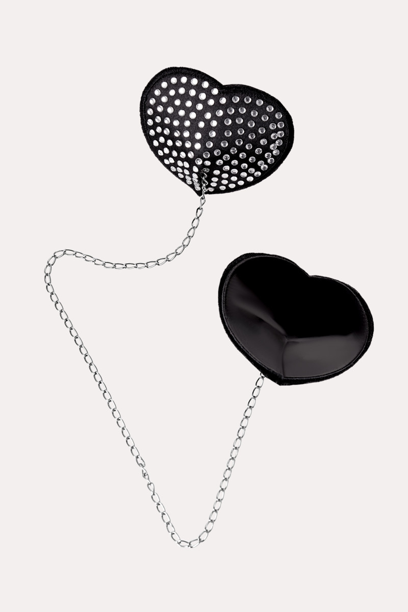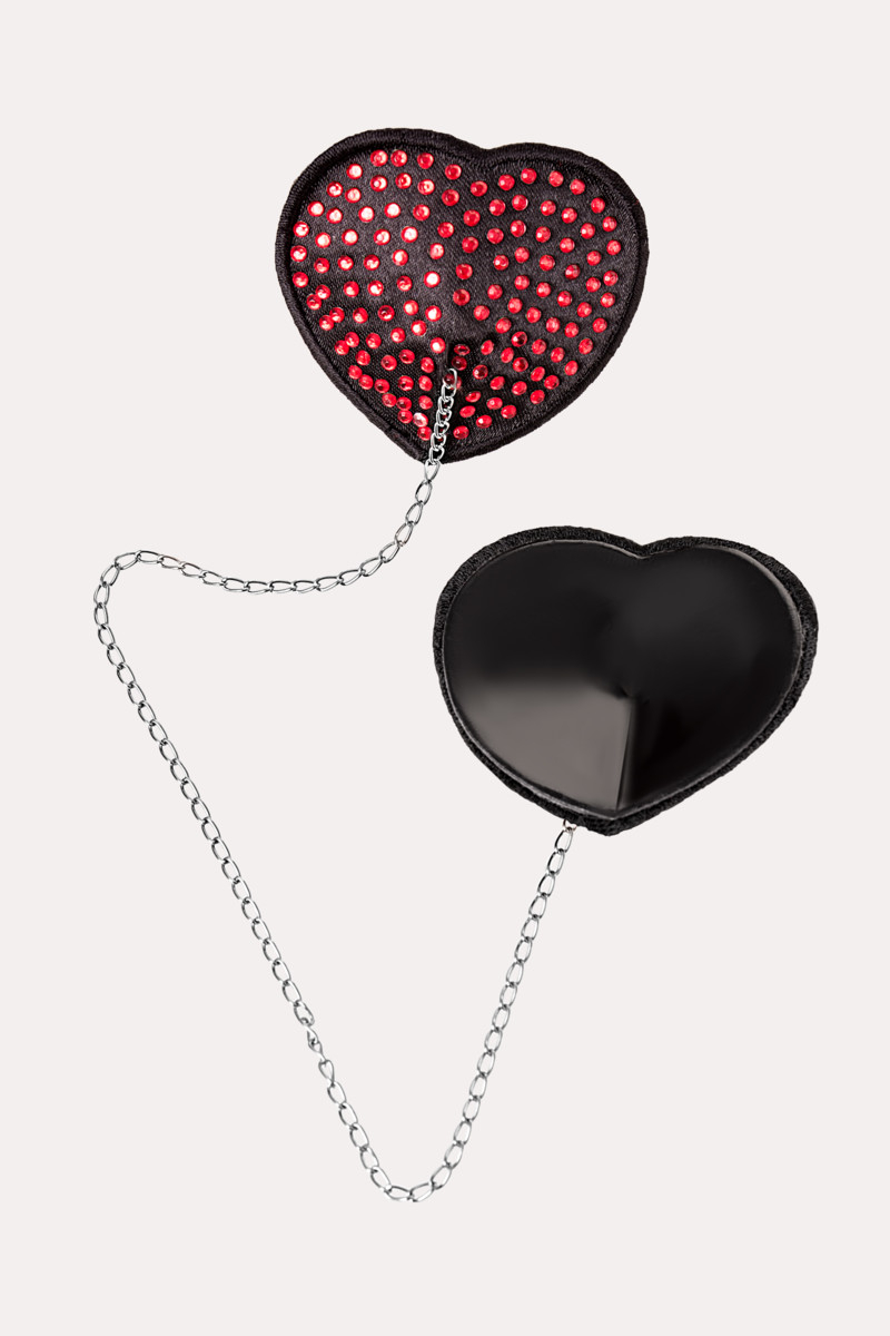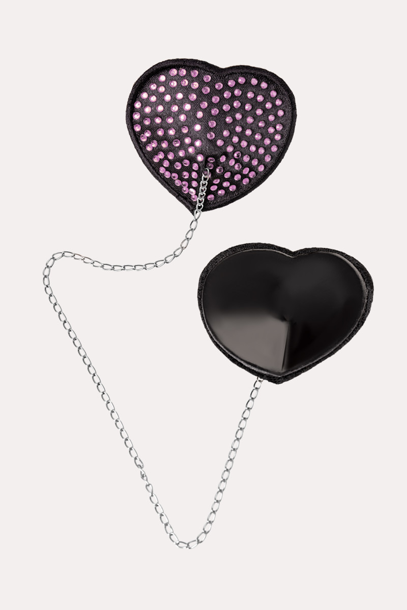 Наклейки на соски в форме сердечек обшитые сатином и декорированы стразами. Пэстисы скреплены между собой серебристой металлической цепочкой, что добавит пикантности в ваши игры, попробуйте потянуть за неё и вы все сами почувствуете.