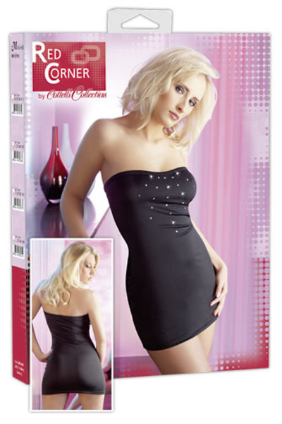 Маленькое чёрное платье без бретелек, выполненное из полупрозрачной ткани и украшенное стразами.
