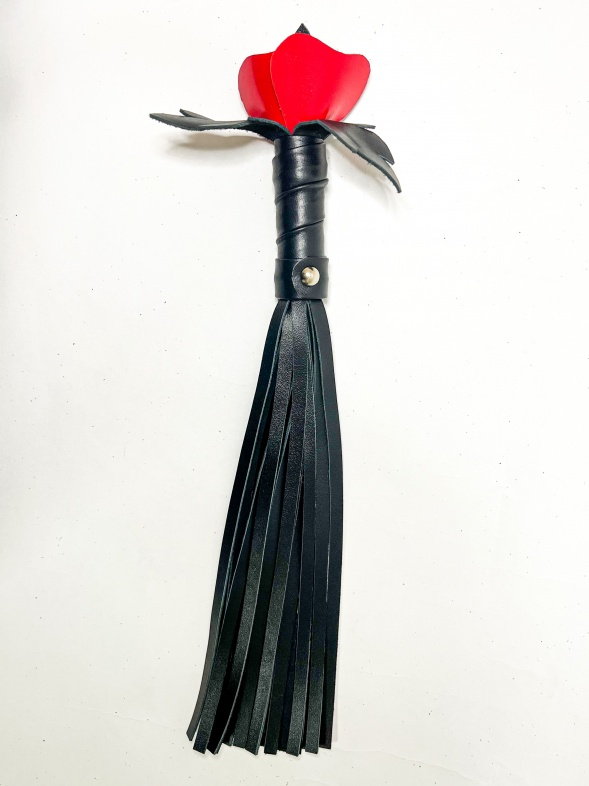 Восхитительная мини-плеть, украшенная красной розой. Цветок полностью выполнен из натуральной лаковой кожи, листочки розы,рукоятка и хвосты плети-натуральная мягкая кожа.