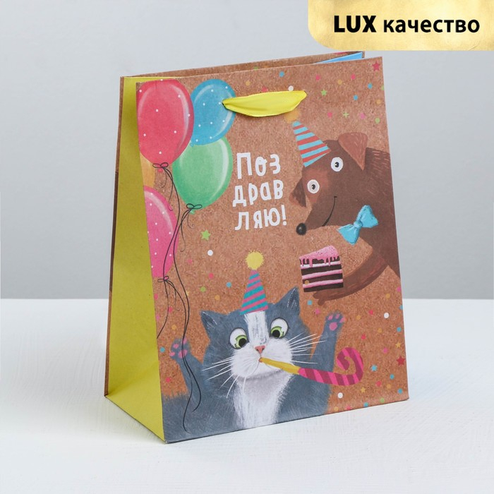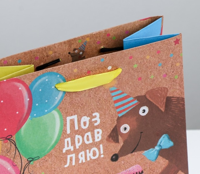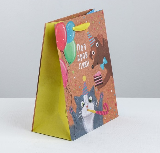 Вертикальный пакет с поздравлением и потешным рисунком выполнен из плотной крафтовой бумаги с атласными ручками.