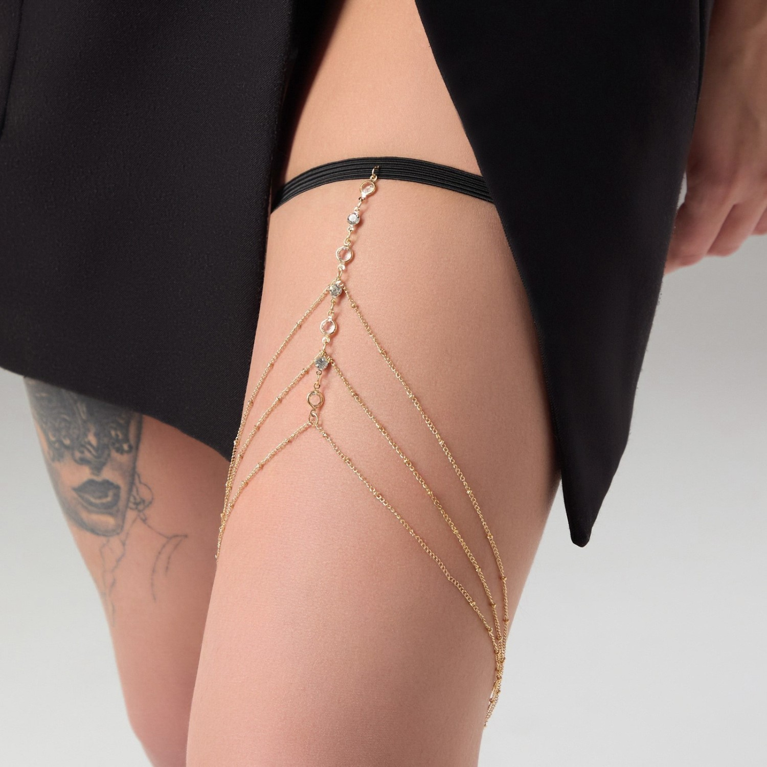 Оригинальное украшение с цепочками выполнено из тонкого металла золотистого цвета. Может использоваться как аксессуар для романтического свидания с продолжением или для дополнения повседневного образа.