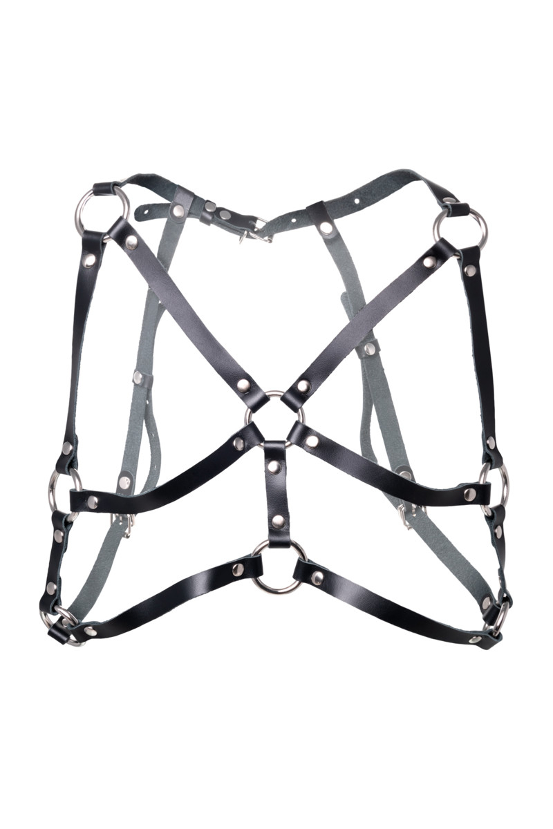 Портупея фиксируется сзади, в области бюста. Хорошая посадка по фигуре обеспечивается благодаря регулируемым ремешкам. Они выполнены из экологичной натуральной кожи.