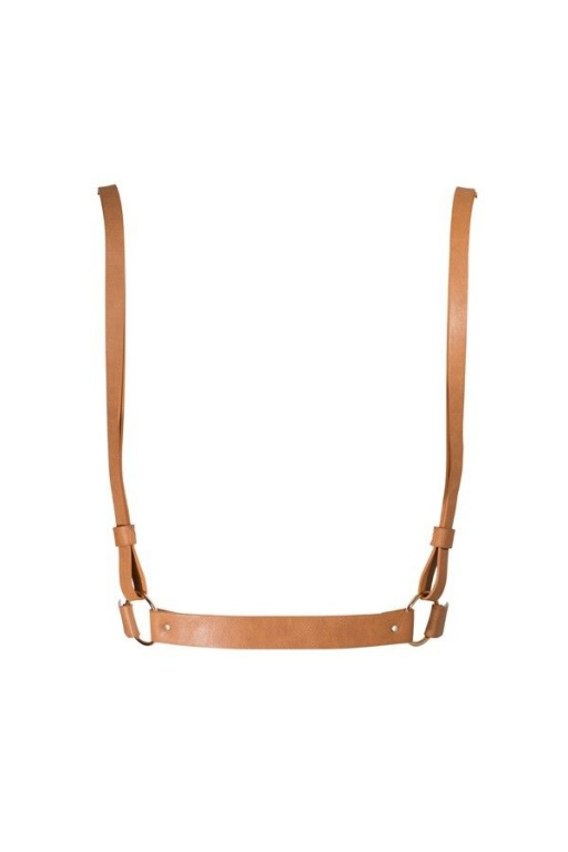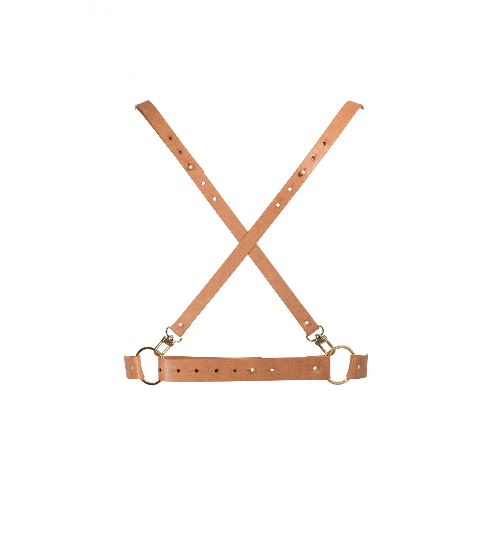 Очень красивая портупея, напоминающая стилизованные подтяжки. Смотрится стильно и не пошло, поэтому ее вполне можно носить с повседневной одеждой, чтобы добавить в образ немного сексапильности. Но и с эротическим нарядом (или совсем без одежды) такая портупея также будет шикарно выглядеть. Золотистые заклепки и отделка вкупе с ремнями под кожу выглядит просто потрясающе! При помощи карабинов закрепите шлейки на кольцах сзади параллельно друг другу для эффекта бретелей или перекрестите между собой, чтоб подчеркнуть спину. Можно носить на талии, немного выше или под грудью.