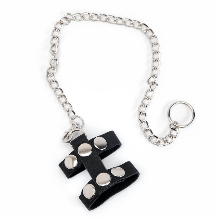 Традиционные поводки слишком обычны для вас и не вызывают интереса? В таком случае металлический поводок в виде цепочки с кожаным корсетом из двух петель позволит вашей партнерше водить вас за самое интимное место на вашем теле.