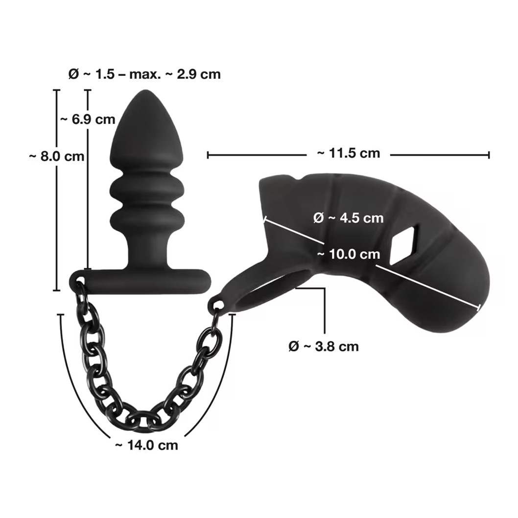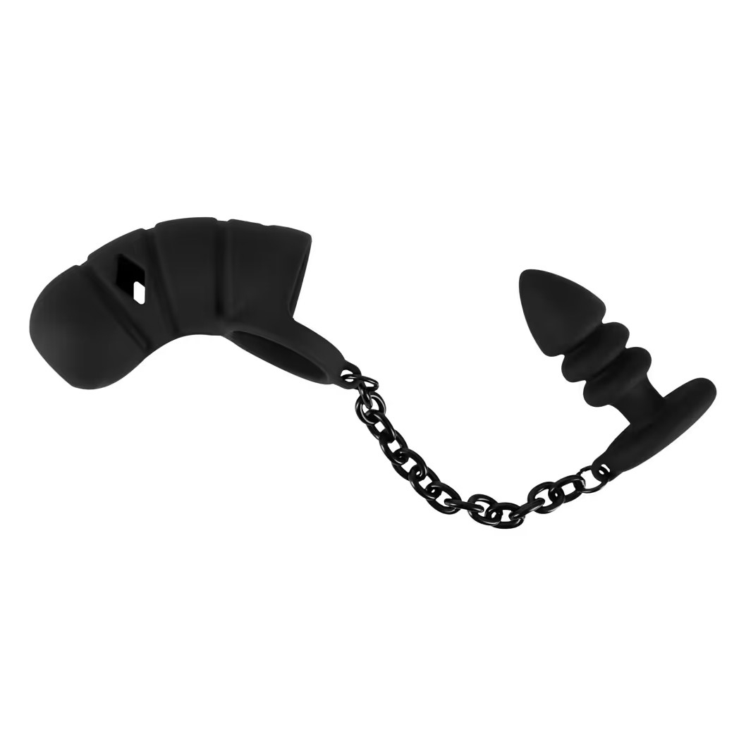С этим девайсом вы почувствуете 4 вида стимуляции: пенис с удовольствием заперт, яички плотно сжаты, ребристая анальная пробка массируется сзади, а соединительная цепь обеспечивает возбуждающее натяжение и возбуждающее трение о промежность.