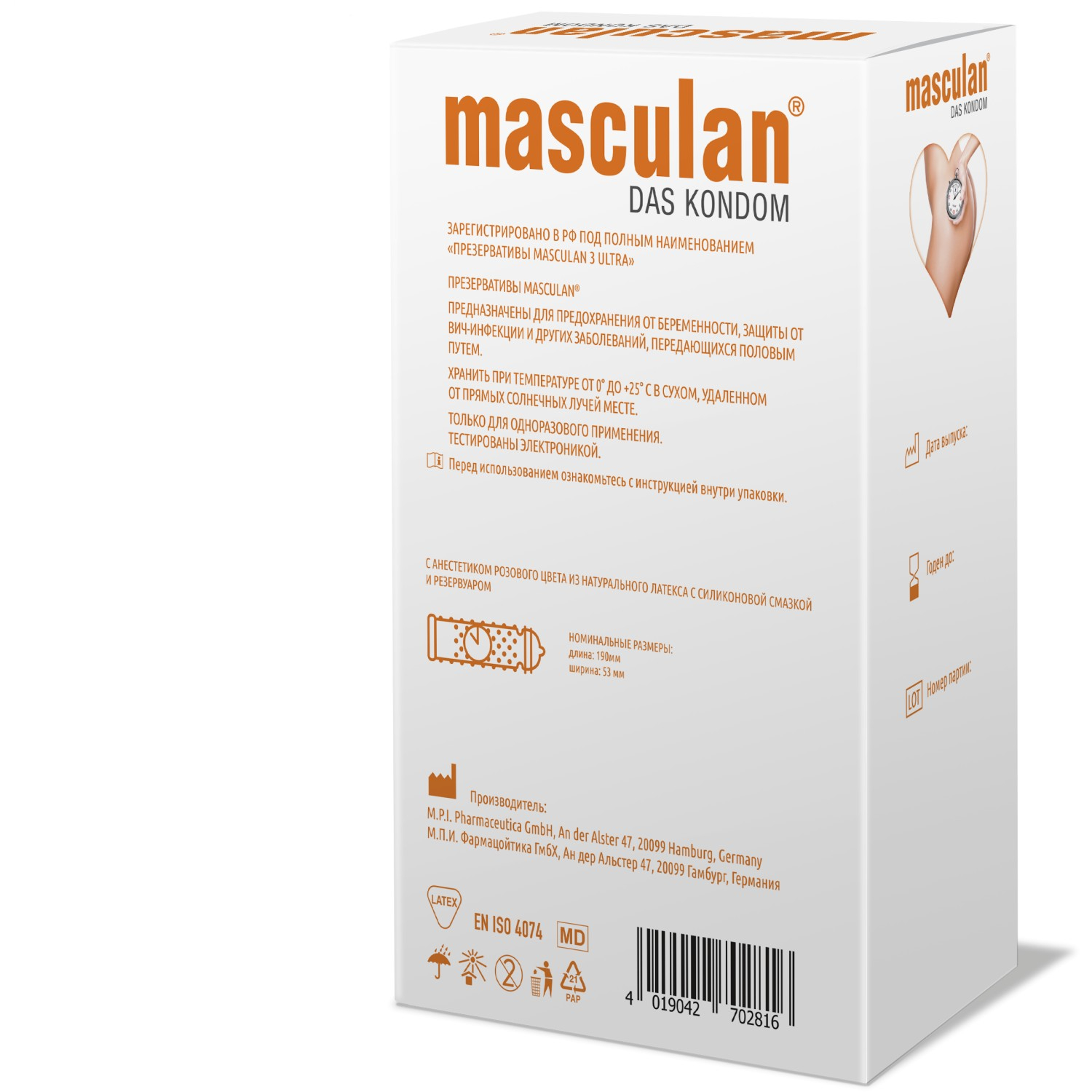 Masculan Ultra Long Pleasure - презервативы с анестезирующей добавкой (бензокаином) для продления полового акта. Пропитка анестетиком кусочка воска, расположенного в кончике презерватива, обеспечивает его воздействие только на нужные участки пениса.