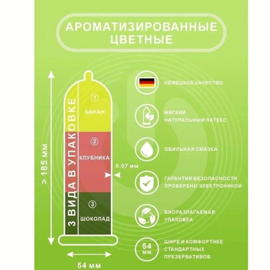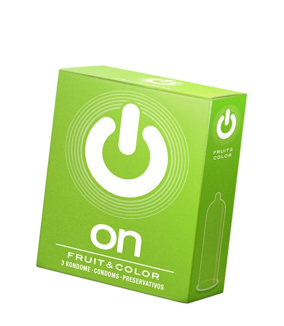 Ультрамягкие цветные ароматизированные презервативы ON классической формы с накопителем имеют яркий, насыщенный вкус: чёрный — с ароматом шоколада, красный — с ароматом клубники, жёлтый — с ароматом банана.