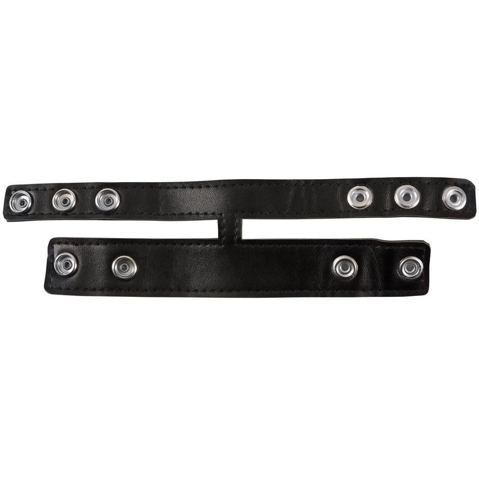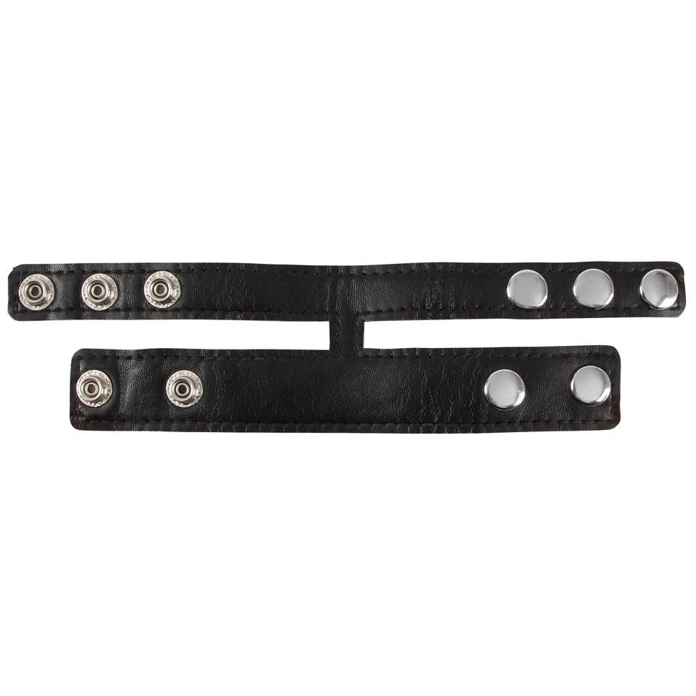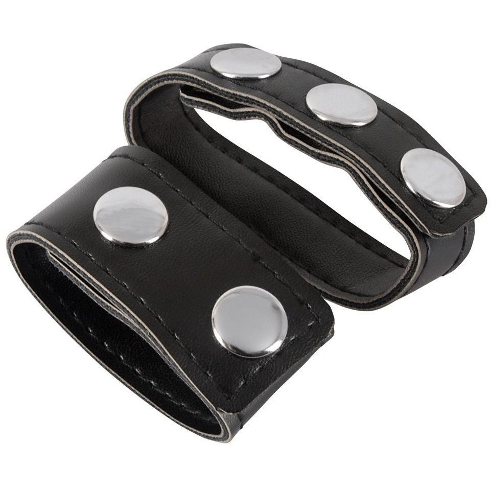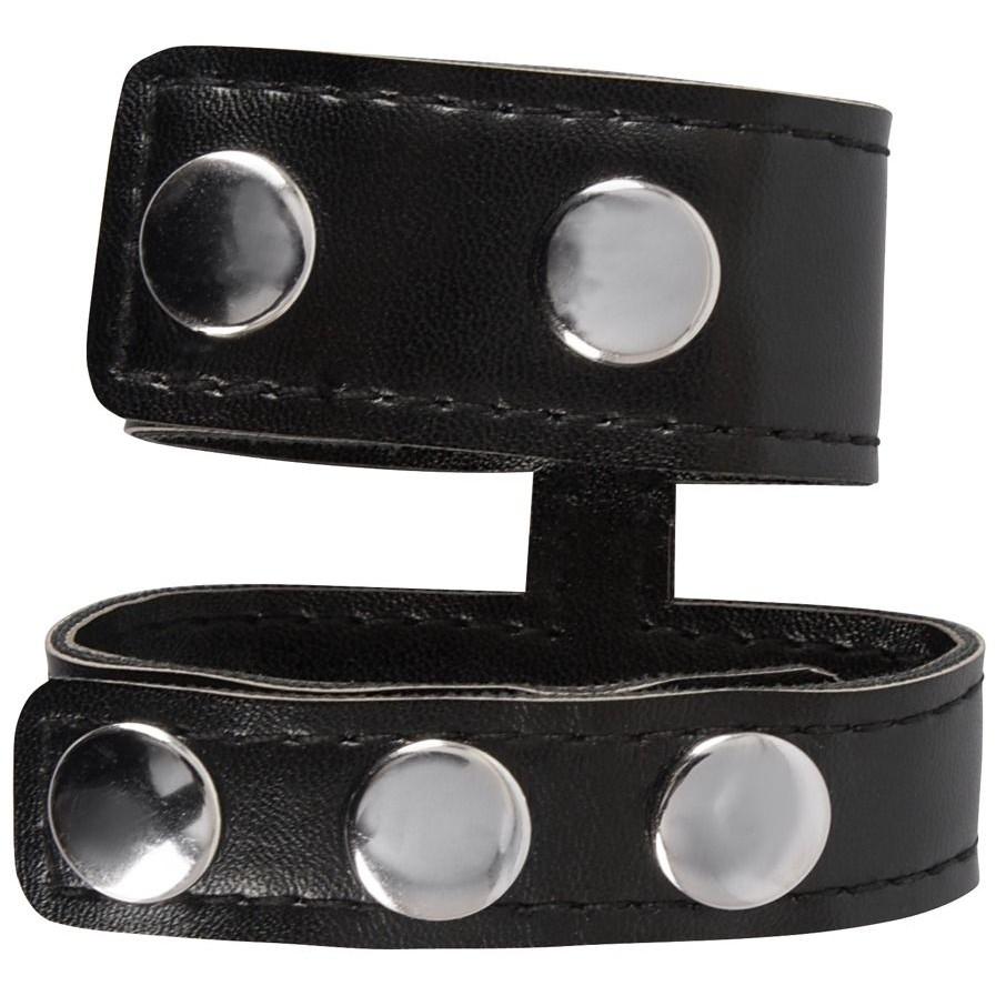 Двойная утяжка для пениса и мошонки. Игрушка приставляет собой два ремешка из искусственной кожи, соединенных между собой перемычкой. Один ремешок фиксирует основание пениса, а второй утягивает яички. Такая конструкция эффективно блокирует отток крови из половых органов, благодаря чему мужчина становится более выносливым и может совершать фрикции длительное время.