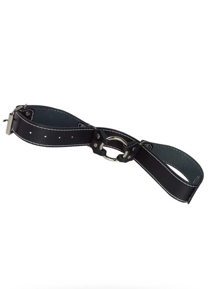 Ремень-фиксатор от российского производителя, выполнен из мягкой высококачественной кожи чёрного цвета. Размер регулируется за счет удобной пряжки, В ремень вшито кольцо-рамка, которое можно использовать как кляп. Две прямоугольные рамки для того чтобы протягивать ремень и делать его в форме восьмерки. Ремень декорирован по краю строчкой из белых ниток, что очень эффектно смотрится. Внутренняя сторона ремня приятная, и замшевая на ощупь.