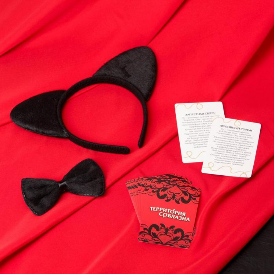 Внутри вас ждут 10 карточек с горячими сценариями ролевых игр. Изучите карточки, выберите подходящие и воплотите написанное в жизнь. Партнёрша может использовать кошачьи ушки и мягкую галстук-бабочку, чтобы добавить образу перчинки.