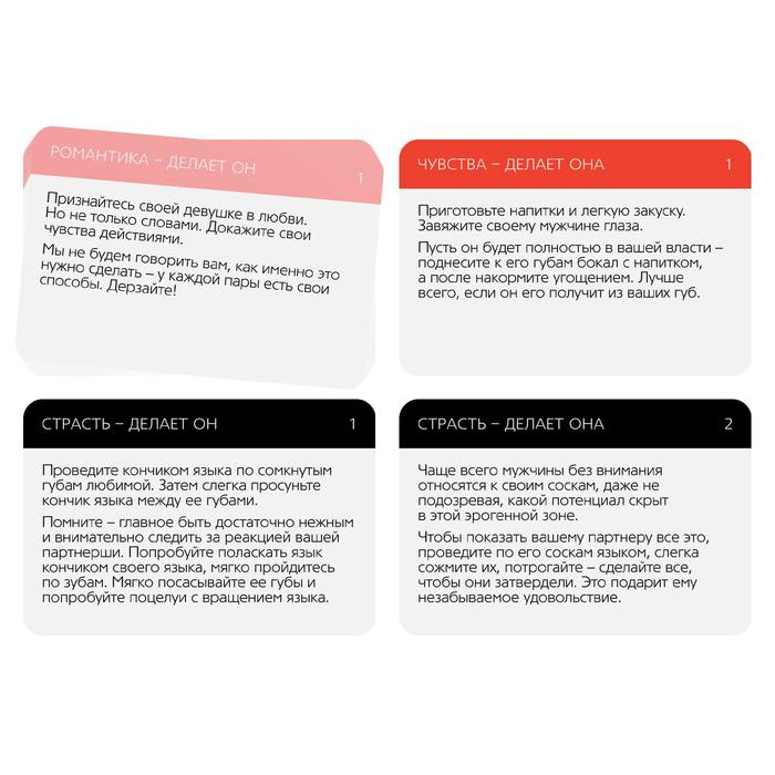 На одной стороне карточки указаны действия для девушки, а на другой — для мужчины. Ознакомьтесь с информацией на обеих сторонах выбранной карты и дерзайте.