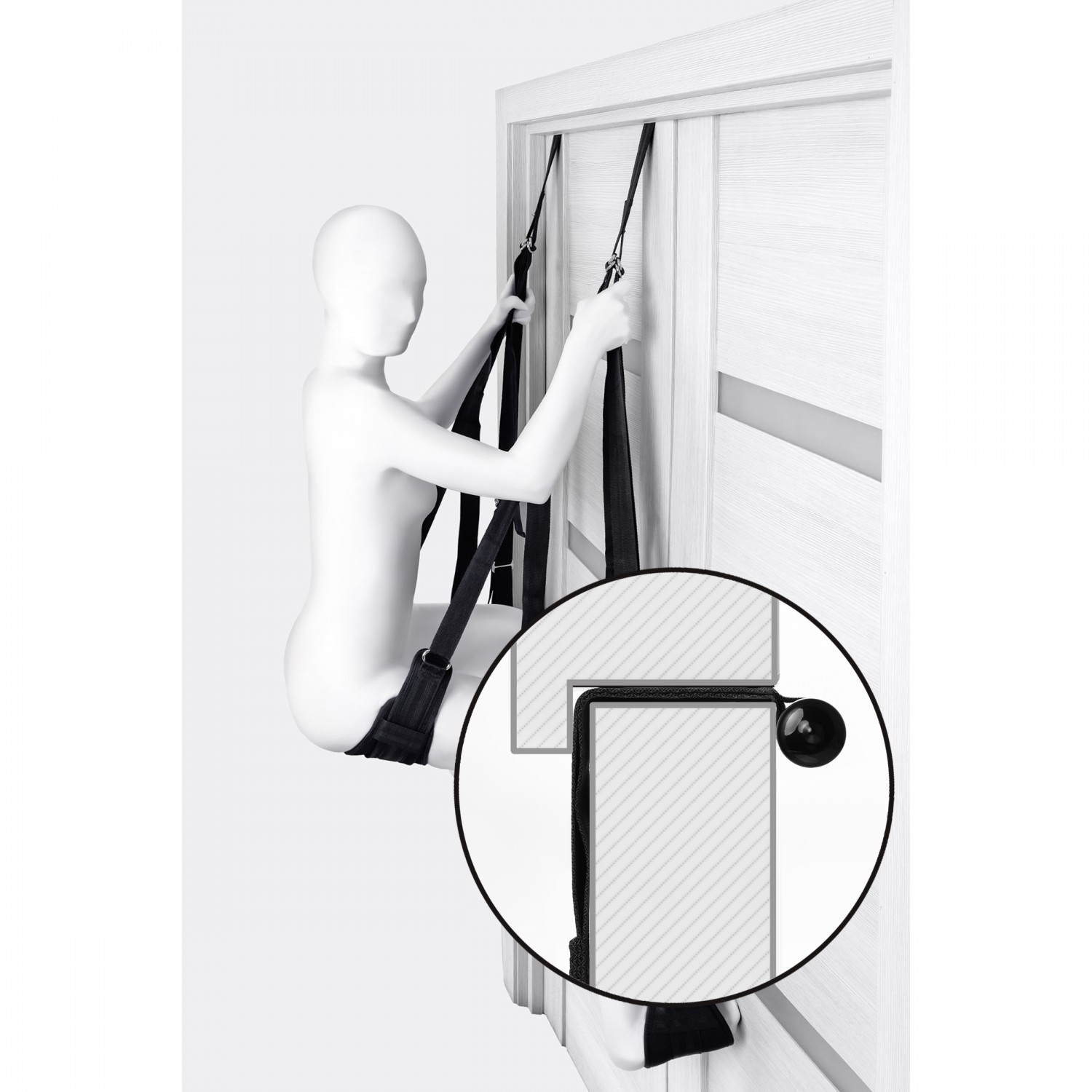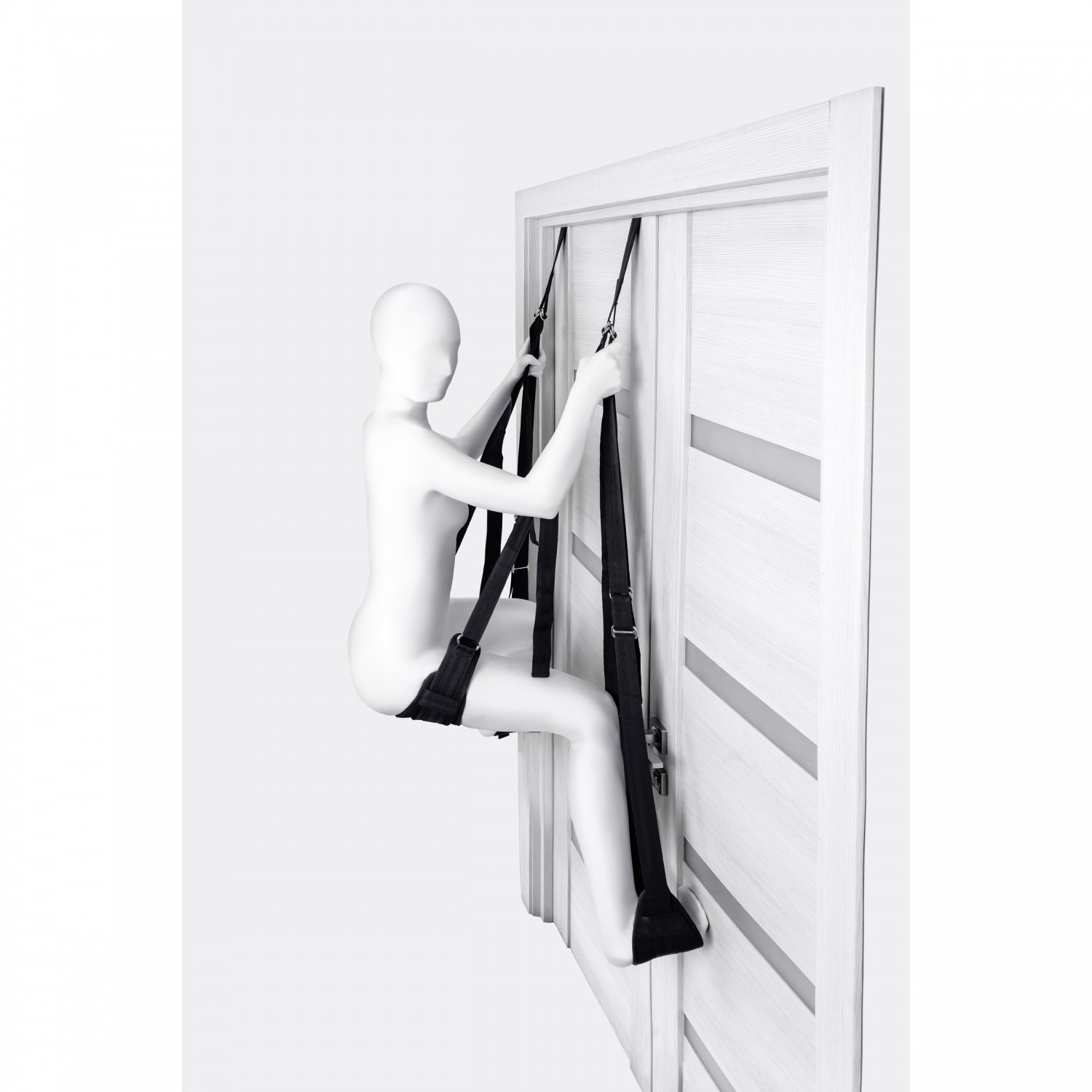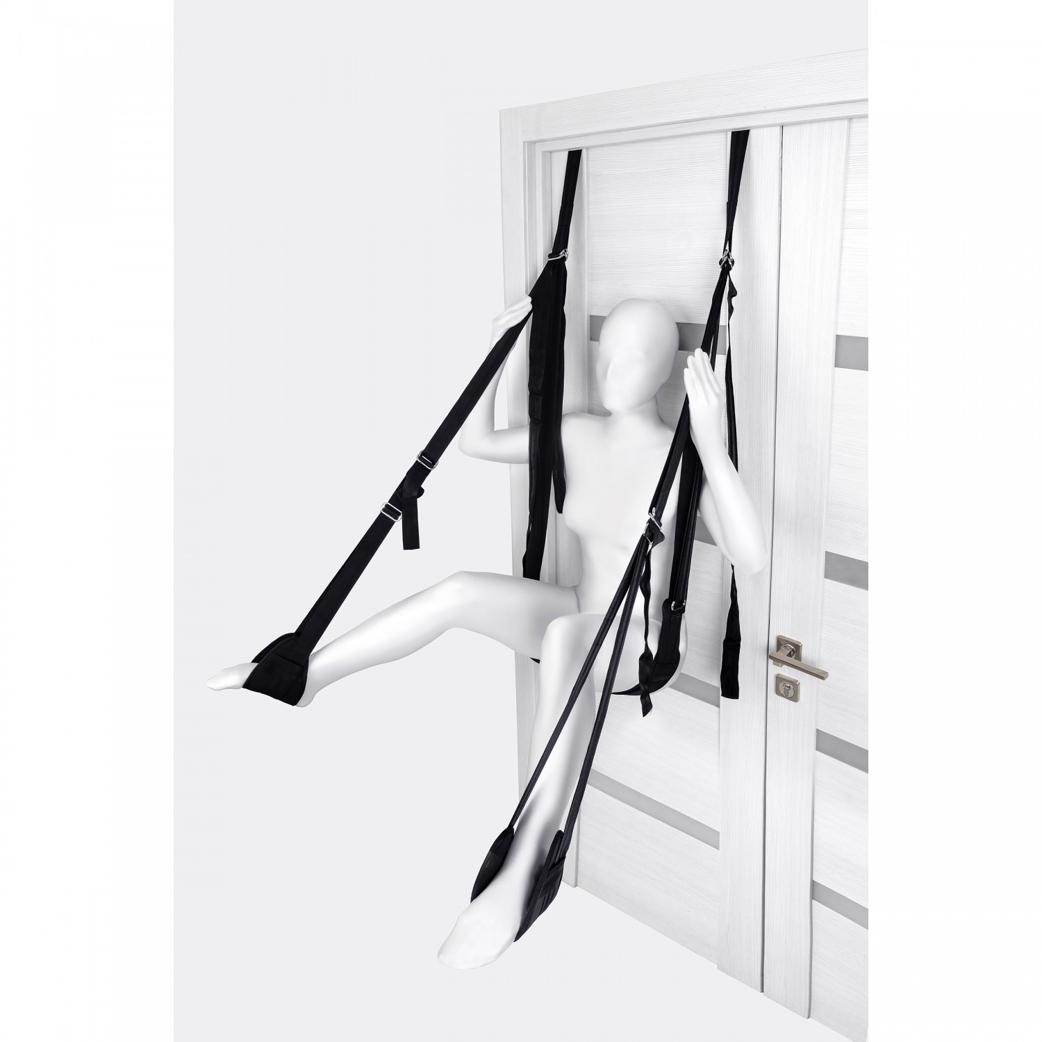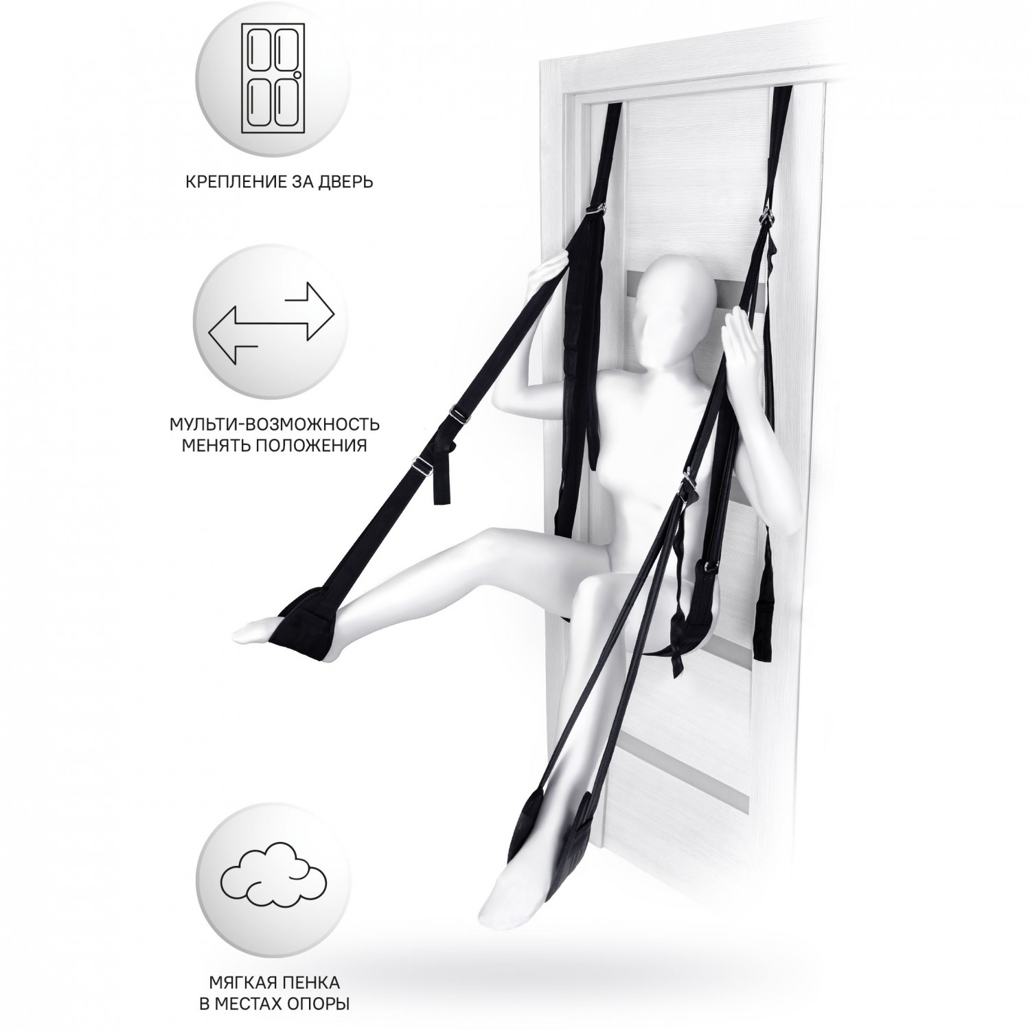 Качели фиксируются за дверью с помощью пластиковых цилиндров, поэтому вам не понадобятся дополнительные крепежные элементы для их установки. Все ремни регулируются, давая возможность бесконечно менять позы: сидя, полулежа, лицом или спиной к партнеру. Мягкие петли-опоры нежно обхватывают и поддерживают тело в любом положении.
