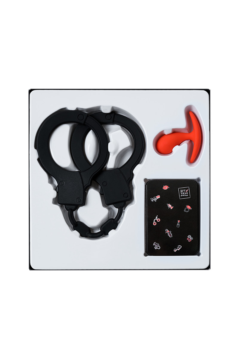 В стильной коробке есть все, чтобы провести время с удовольствием: качественные аксессуары: наручники и анальная пробка из медицинского силикона, плюс 36 карточек со сценариями для нескучного времяпрепровождения.