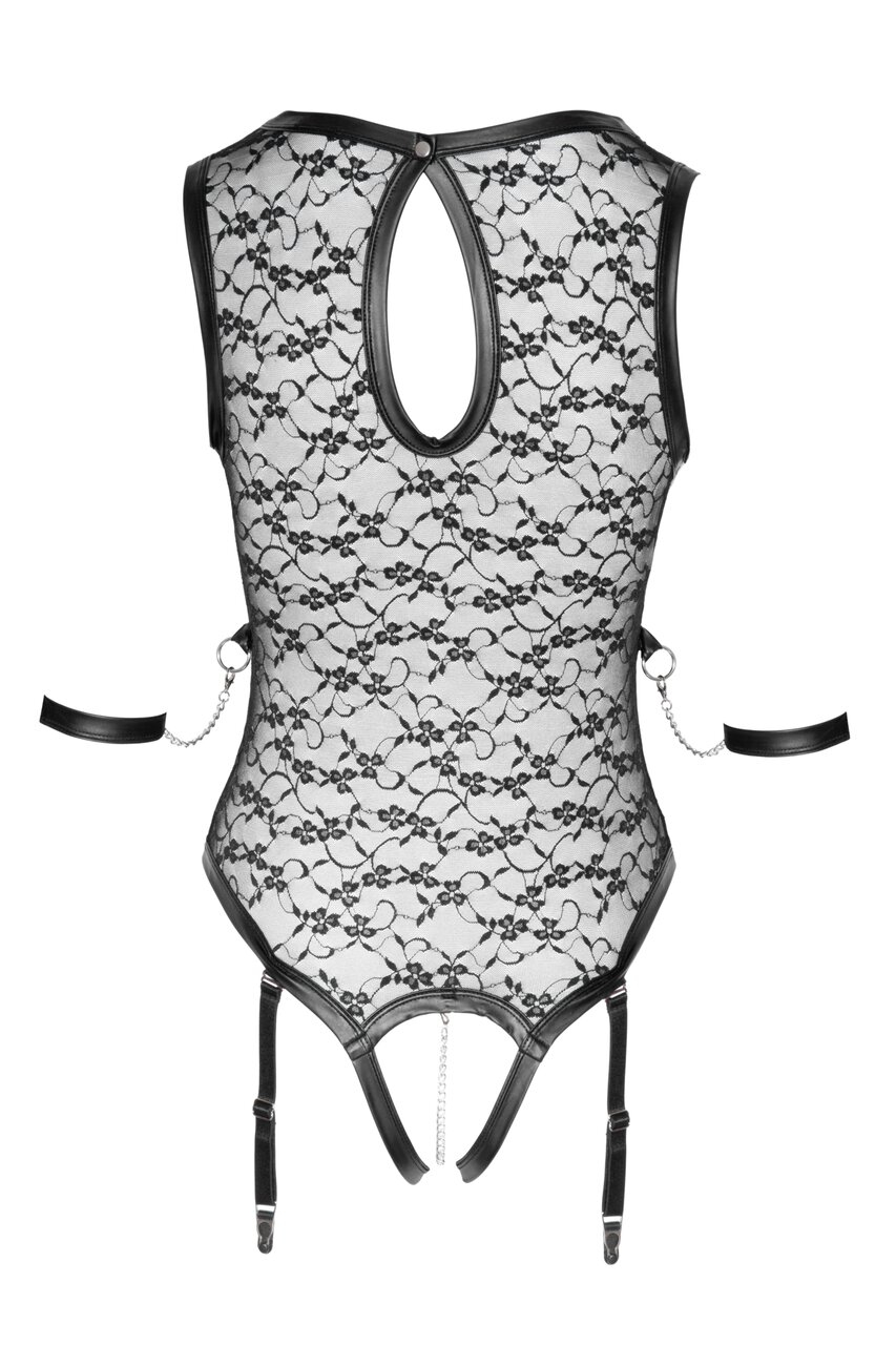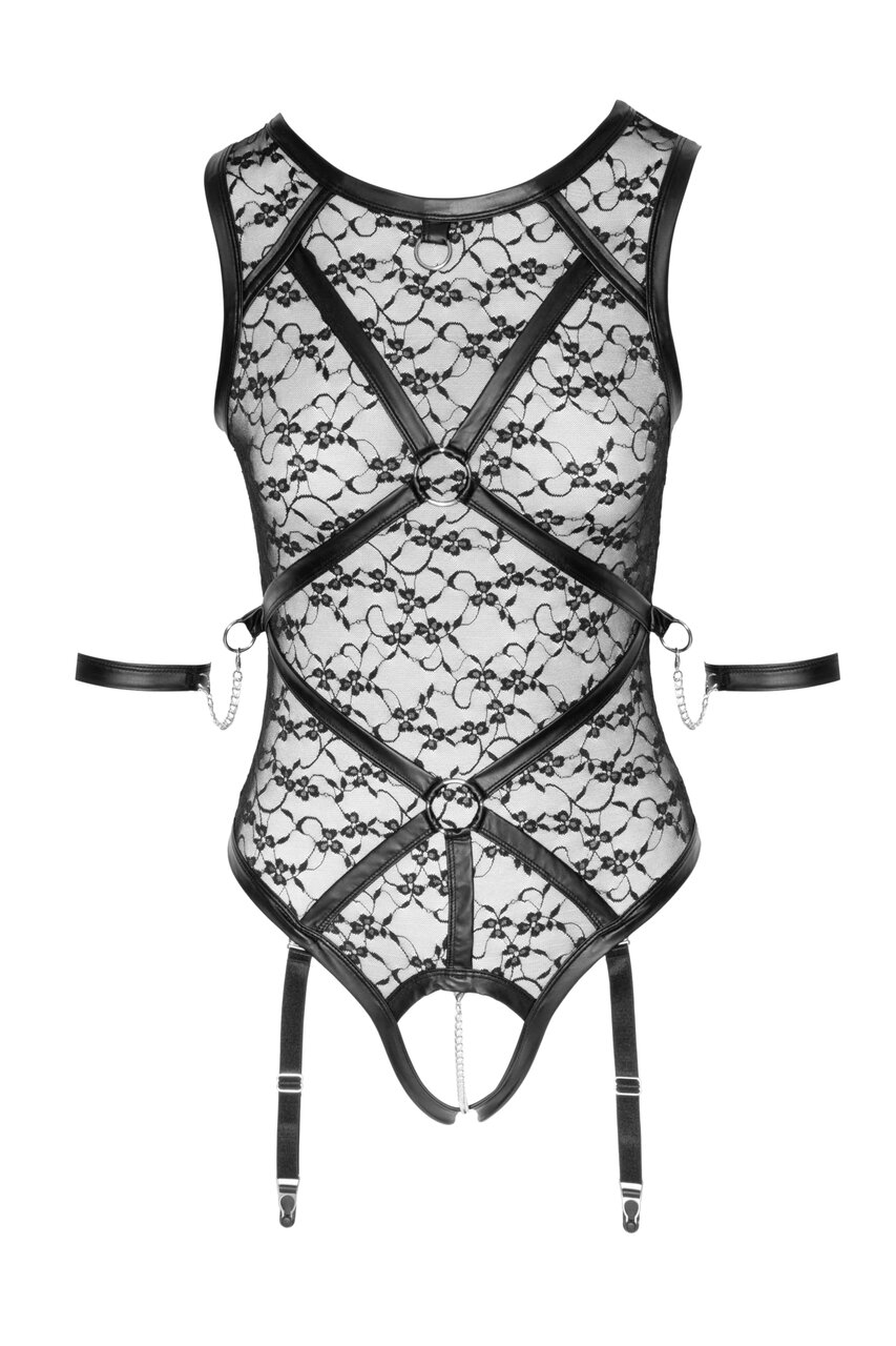 Боди полностью открыто в шаге и декорировано съемной металлической цепью - это не просто приглашение, но и стимулирующее удовольствие для обладательницы боди. Гарус возбуждения добавляют подвязки для чулок, они регулируются, а также их можно отцепить совсем. В комплекте нет чулок, их необходимо приобрести отдельно, на нашем сайте.