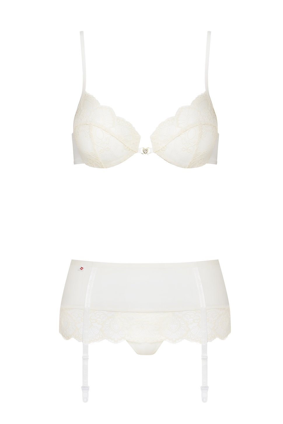 Комплект сочетает эластичную ткань белого цвета и кружево цвета экрю с красивым, элегантным дизайном.
