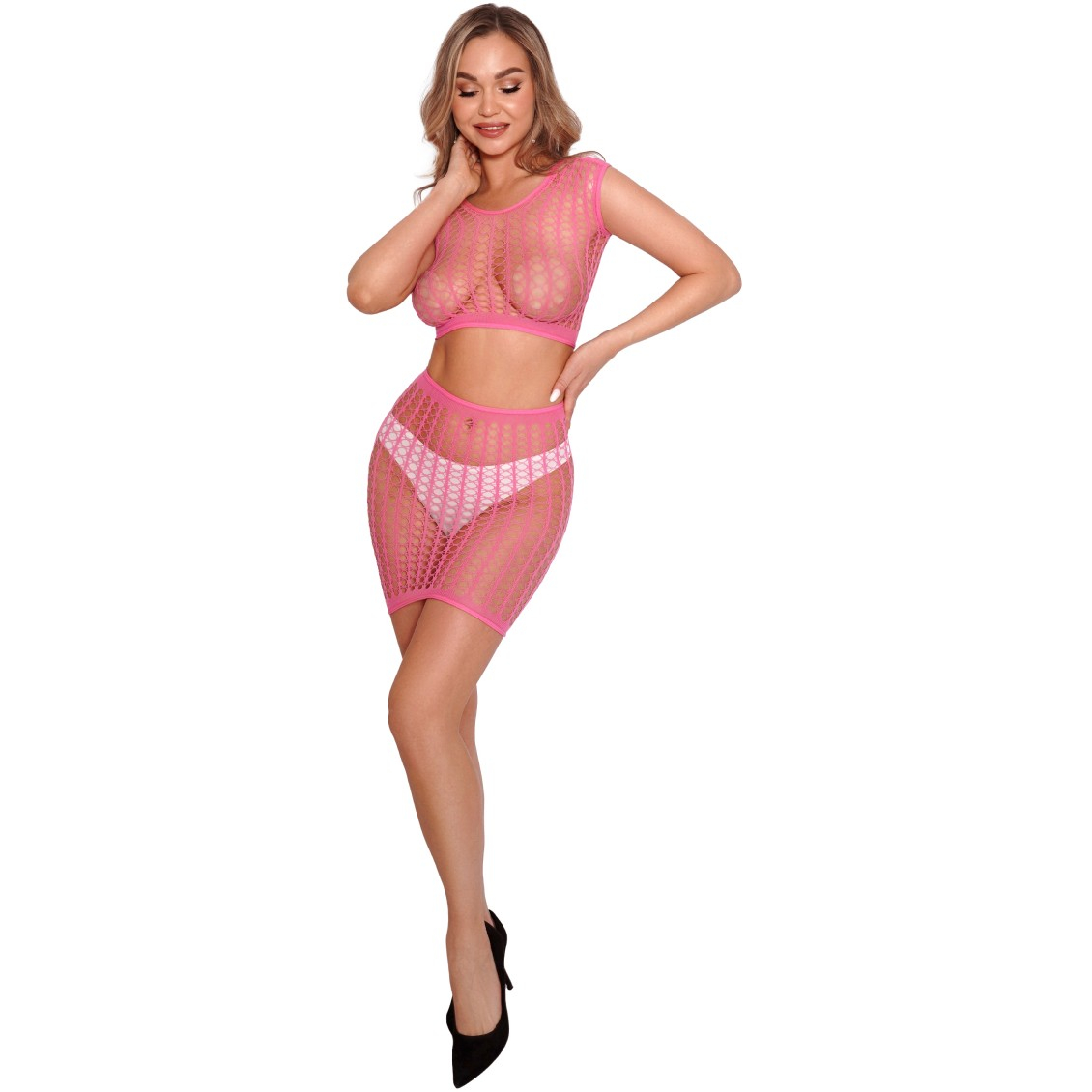 Комплект яркого и соблазнительного сетчатого белья, состоящего из полупрозрачного топа и короткой юбки. Этот комплект подарит вам ощущение, что вы одеты, но на самом деле вы абсолютно голы. Также этот комплект будет очень вкусно смотреться совместно с вашим белым бесшовным бельем.