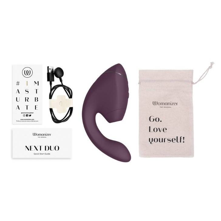 Комплектация: двойной стимулятор Womanizer Next Duo, хлопковый чехол для хранения, дополнительная насадка для стимуляции (размер M), краткое руководство пользователя, информация о соответствии требованиям и безопасности, наклейка #Imasturbate, USB-кабель