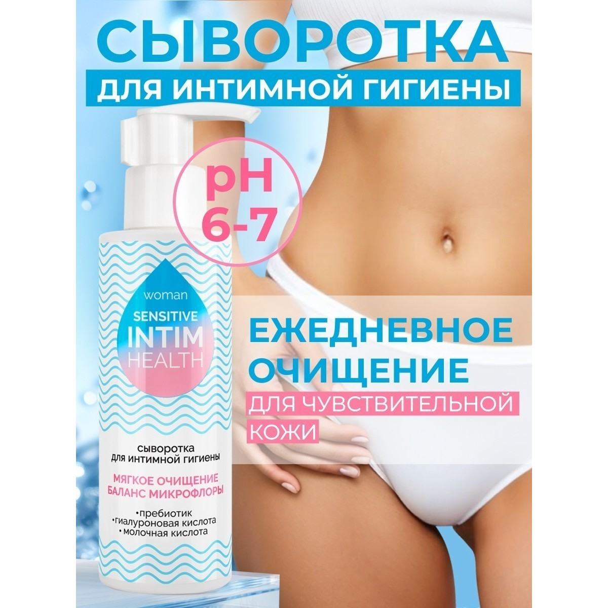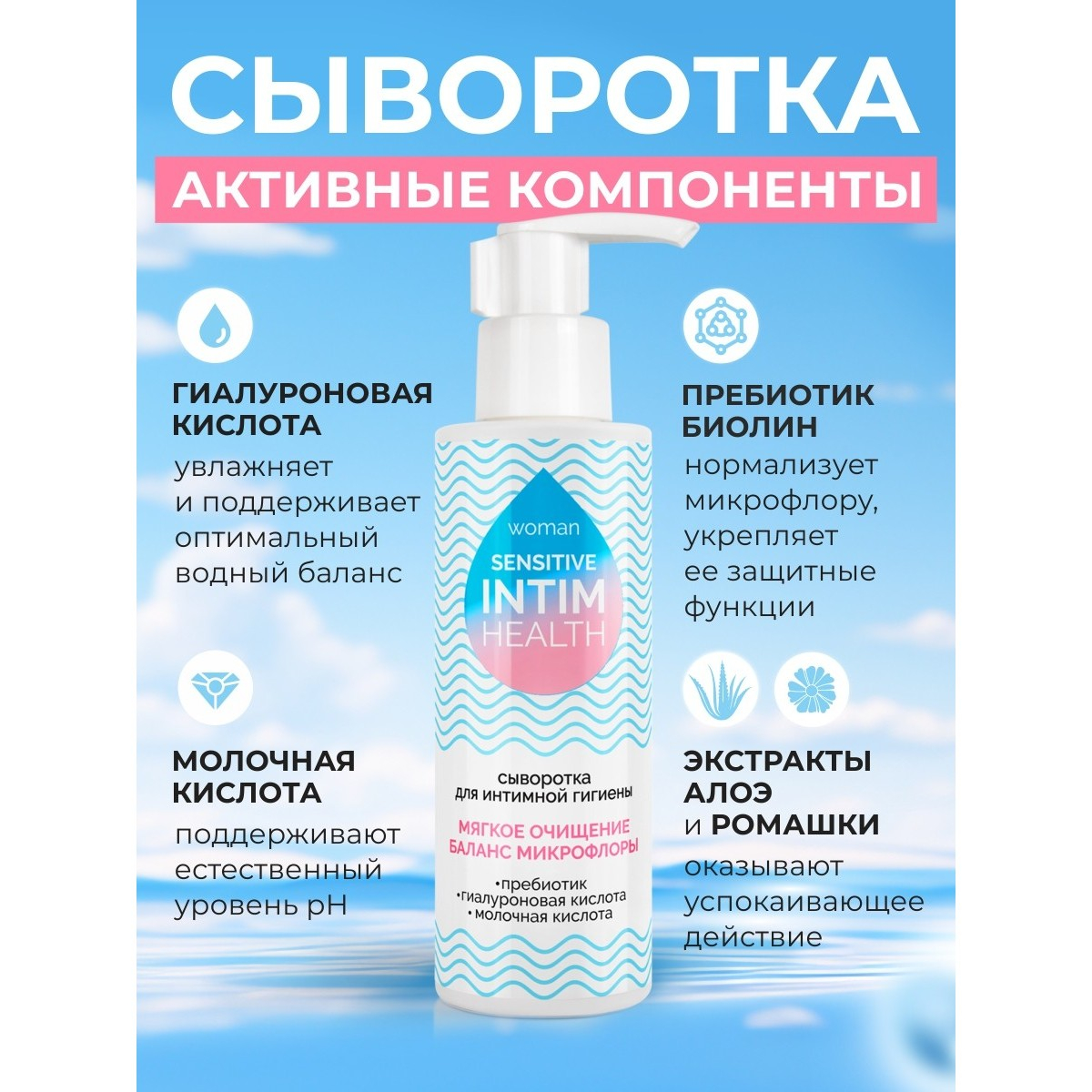 Сыворотка бережно очищает, увлажняет и поддерживает оптимальный уровень pH, сохраняя естественный баланс микрофлоры. Она эффективно уменьшает дискомфорт, сухость, зуд и раздражение, возвращая ощущение свежести и комфорта на длительное время.