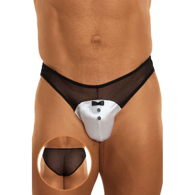 Когда в комнату входит леди, истинные джентльмены встают. И этот - во фраке и белоснежной рубашке на пуговках – не станет исключением. Оригинальные трусики-стринг а-ля смокинг приумножат вашу сексуальность, а также подскажут вам не один вариант интересных сценариев для ролевых игр.