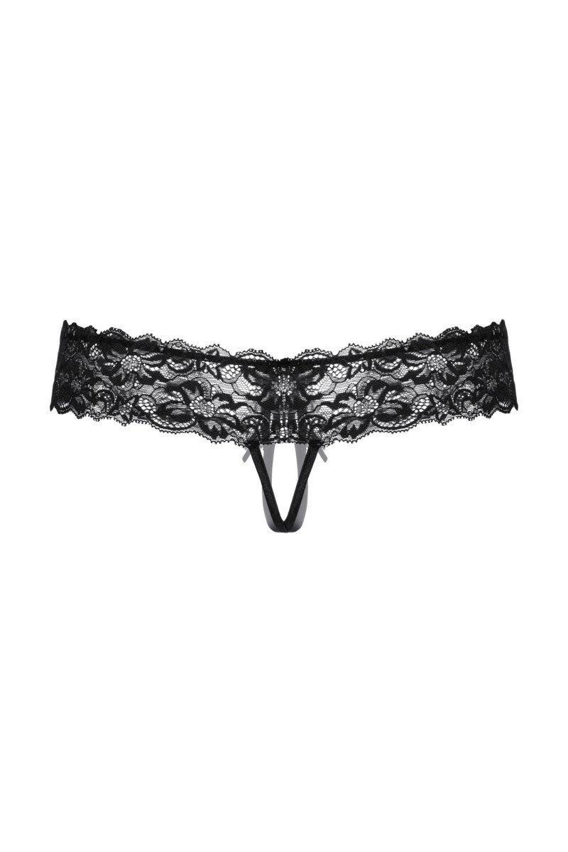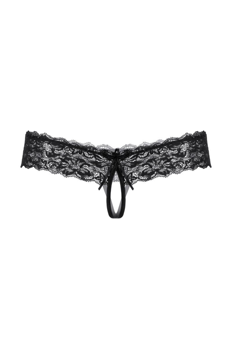 Трусики с открытым доступом ко всем интимным зонам, выполнены из роскошного кружева. Широкая кружевная резинка с необычно углубленным верхним краем подчеркивает соблазнительную линию бедер. Спереди декорированы кокетливым бантиком.