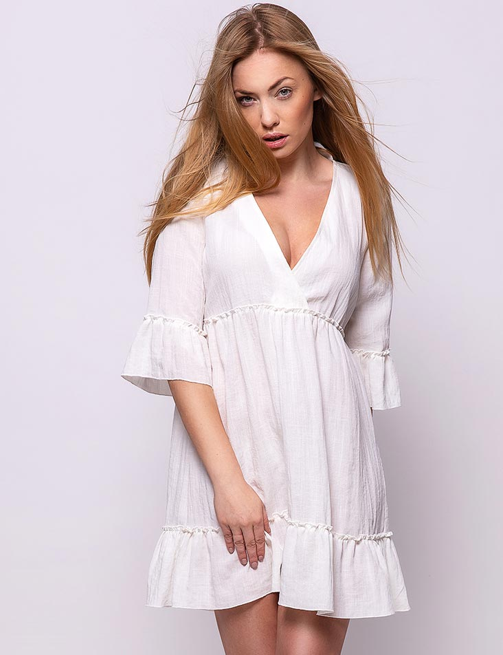 Туника стильная, свободного кроя - она подарит ощущение свободы и легкости. Ворот оформлен глубоким глубоким V-образным вырезом горловины. Рукава и подол декорированы широкими оборками.