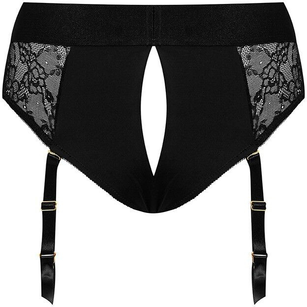 Широкий эластичный пояс обеспечивает мягкую посадку по фигуре. Съемные регулируемые по длине пажи для чулок декорированы атласными ленточками на концах. Трусики выполнены из плотного эластичного материала с кружевными прозрачными вставками. Сзади красивый фигурный вырез, который дает доступ ко всем аппетитным зонам женщины. Все очень эстетично, сексуально и смотрится дорого и богато.