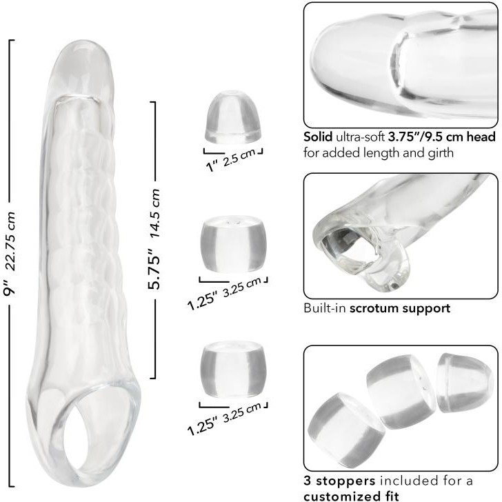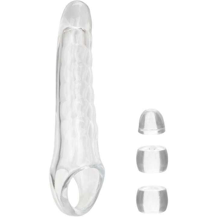Performance Maxx Clear Extension Kit — это универсальная насадка для увеличения длины и объёма полового члена, подходит под любой размер, благодаря вставкам, регулирующим глубину насадки. Прочная сверхмягкая головка и рельефный ствол обеспечивают максимально глубокое удовлетворение для обоих партнёров. У насадки предусмотрено кольцо на мошонку, оно исключает сползание и отлично фиксирует девайс на члене. Кольцо обеспечивает хорошую эрекцию и яркие оргазм.