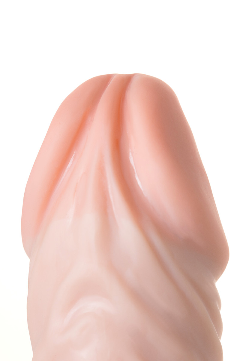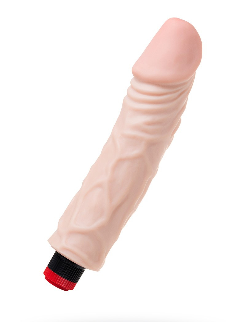 Огромный реалистичный вибромассажёр телесного цвета. Имеет форму члена с ярко-выраженной розовой головкой.