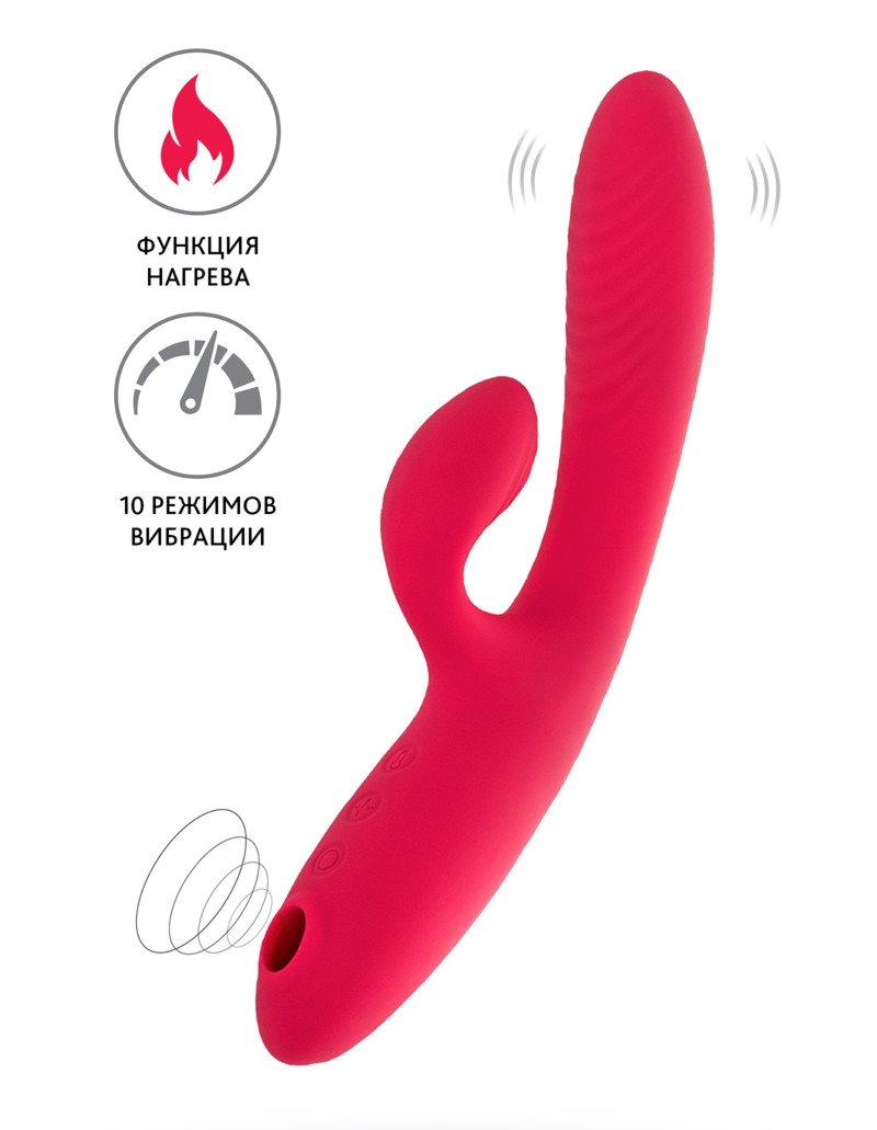 С одной стороны – классический вибратор-кролик с отростком для стимуляции клитора. Ребристая поверхность обеспечивает деликатную стимуляцию ваших интимных зон. Функция нагрева вибратора обеспечит комфортные ощущения и добавит пикантности и страсти в вашу игру. Два мощных мотора работают в 10 режимах вибрации.