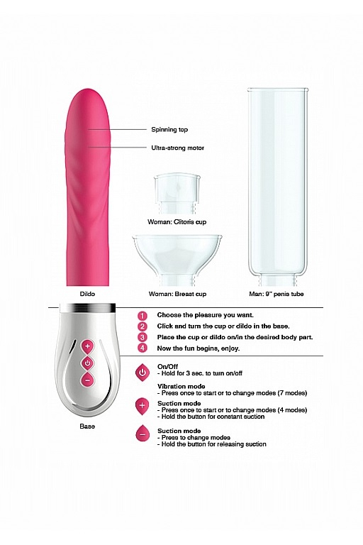 В какой-то степени уникальный вибростимулятор, способный осуществлять различные формы стимуляции эрогенных зон женского тела, используя как классическую вибрацию, так и вакуумно-волновое воздействие. Это настоящий «комбайн», основой которого выступает вибромодуль-помпа, размещенный в рукоятке. В набор входят четыре сменные насадки – втулка-дилдо, как у обычного вибратора и три колбы для вакуумной стимуляции сосков, клитора, груди и вульвы. Вы можете использовать их автономно, а можете сочетать с вибровтулкой.