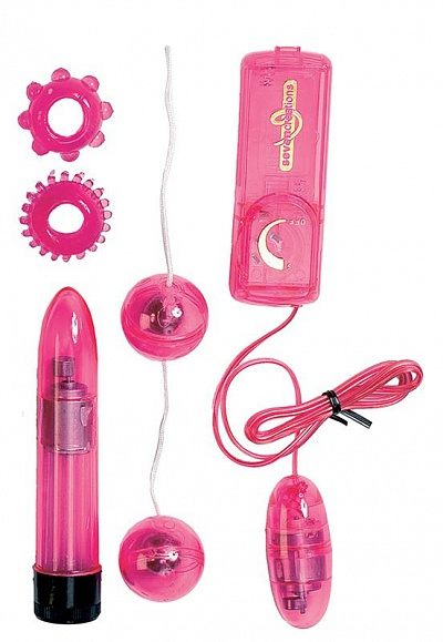 Набор из вибратора, вагинальных шариков, двух насадок с ребристой поверхностью и вибрирующего яйца с дистанционным управлением. Вибратор имеет несколько скоростей вибрации, регулируемые при помощи поворота нижней части игрушки. Виброяйцо имеет одну скорость вибрации. Вагинальные шарики имеют удобный шнурок для удерживания. Длина вибратора - 13 см., диаметр - 2,5 см. Длина виброяйца - 6 см., диаметр - 2,5 см. Диаметр шариков - 3,3 см.