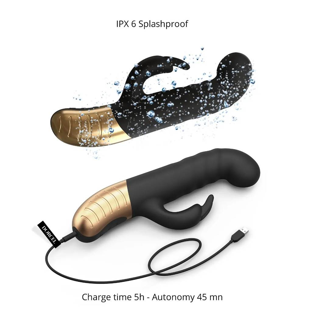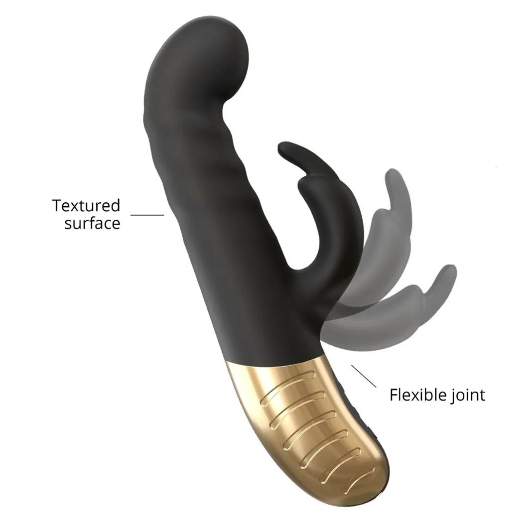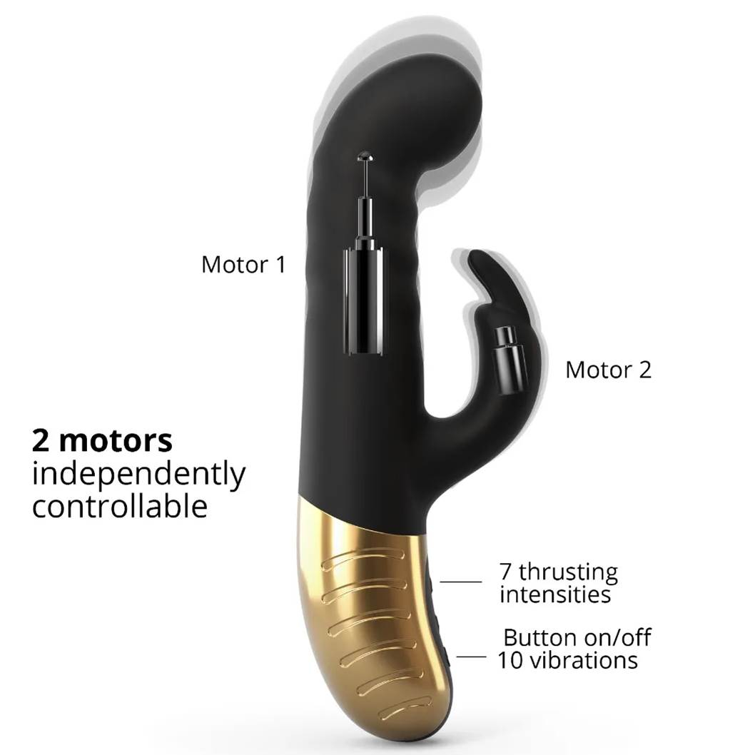 Кролик имеет два мощных тихих мотора, которые работают совершенно по разному. Первый мотор находится в клиторальном отростке в виде зайки и работает в 10 режимах вибрации.