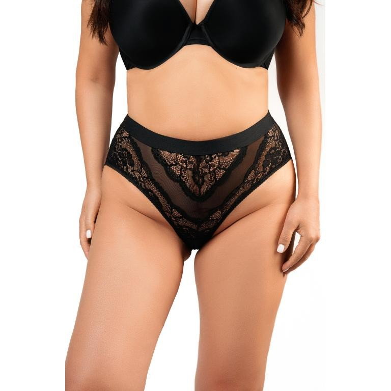 Чёрные трусики с высокой посадкой выполнены из комбинированного мягкого кружева и невесомой сеточки, имеют кружевное обрамление по ягодицам, сексуально подчеркивающее достоинства, а высокая посадка и широкая резинка трусиков скроет все недостатки.