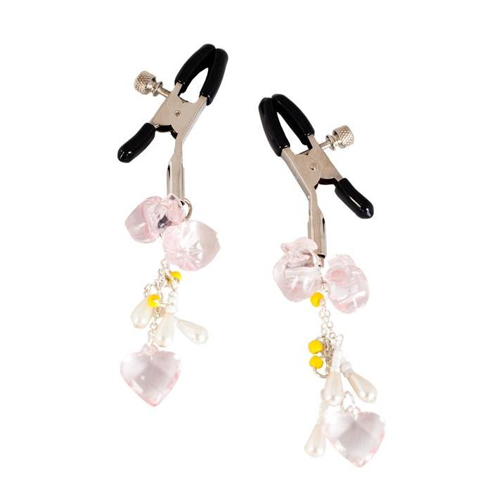 Клипсы для стимуляции сосков, декорированные длинными цепочками с украшениями. Степень сжатия сосков легко регулируется при помощи удобного механизма в виде винтика. Зажимы будут возбуждающе стимулировать соски, а маленькие украшения покачиваться в такт всем вашим движениям.