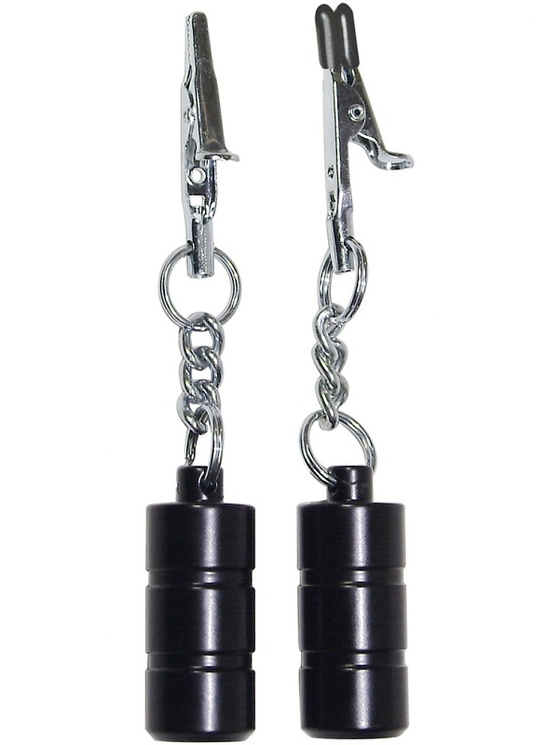 К зажимам прицеплены утяжеляющие подвески для более сильных ощущений. Вес грузика 100 грамм.