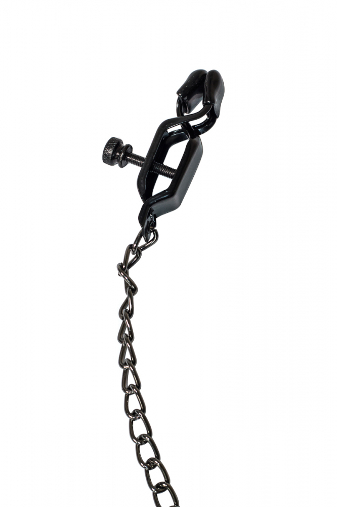 Металлические зажимы для сосков дополнены цепочкой. Они добавят перчинки в ваши игры. Сила сжатия регулируется болтиком.